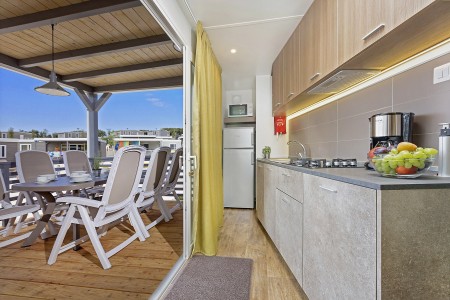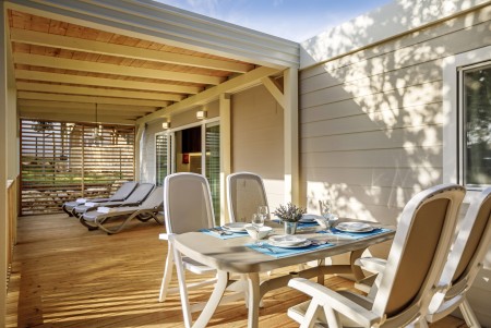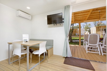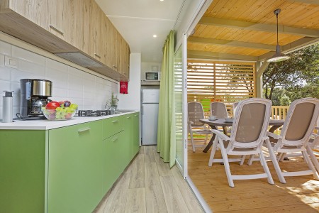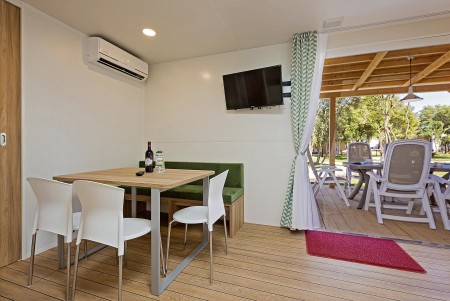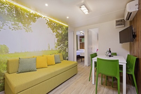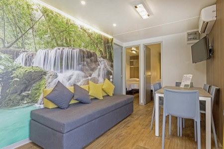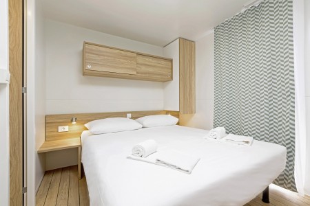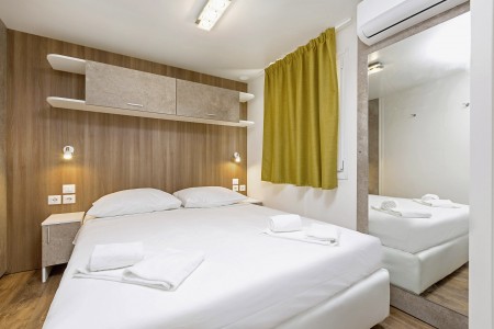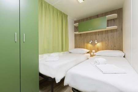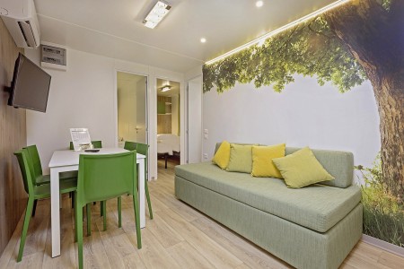 Mobilheim „Oasis Family“ für 6-8 Personen: ca. 40 m², ein Doppelzimmer mit Doppelbett (170 x 210 cm), zwei Doppelzimmer mit je zwei Einzelbetten (je 75 x 200 cm). Wohn-Schlafraum mit Küchenzeile (Herd mit 4 Kochfeldern, Kühlschrank mit Gefrierfach, Mikrowelle, Filter-Kaffeemaschine) und Schlafgelegenheit für zwei Personen (ausziehbare Sitzecke 130 x 190 cm), zwei Badezimmer mit Dusche/WC, überdachte Terrasse mit Sitzgarnitur für 6 Personen und 6 Liegestühlen. WiFi-Internet im Mobilheim verfügbar (kostenlos). Außerdem SAT-TV, Safe und Klimaanlage.