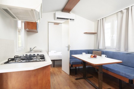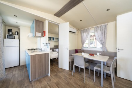 Mobilheim „Classic" für 4-6 Personen: ca. 24 m², ein Schlafzimmer mit Doppelbett, ein Kinderzimmer mit zwei Einzelbetten, Dusche/WC, Wohn-Schlafraum mit Essecke, voll ausgestattete Küchenzeile mit Gasherd, Kühlschrank mit Gefrierfach und Wasserkocher und Schlafgelegenheit für zwei Kinder bis 11,99 Jahre, überdachte Terrasse mit Sitzgruppe und zwei Liegestühlen. Außerdem SAT-TV und Klimaanlage. Gästen der Mobilheime Classic stehen die zwei gemeinschaftlichen Swimmingpool-Komplexe der Anlage zur Verfügung.
