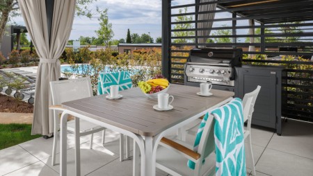 Mobilheim „Premium Plus" für 4-6 Personen: ca. 34 m², ein Schlafzimmer mit Doppelbett, ein Schlafzimmer mit zwei Einzelbetten, zwei Badezimmer mit Dusche/WC, Wohn-Schlafraum mit Essecke, voll ausgestattete Küche mit E-Herd, großem Kühlschrank mit Gefrierfach, Mikrowelle und Wasserkocher, Schlafgelegenheit für zwei Kinder bis 11,99 Jahre, überdachte Terrasse (ca. 25 m²) mit Sitzgruppe und Chill&Grill Zone mit Gasgrill und Loungemöbeln. Außerdem SAT-TV und Klimaanlage. Gäste der Mobilheime Premium Plus teilen sich mit 5-7 Mobilheimen jeweils einen privaten Pool (ca. 24 m²).