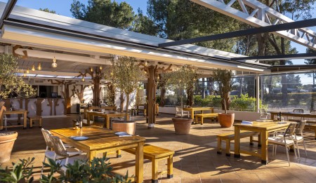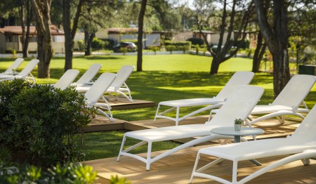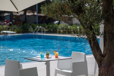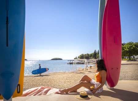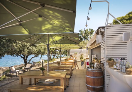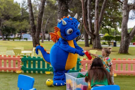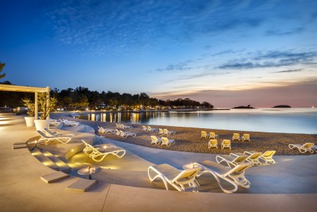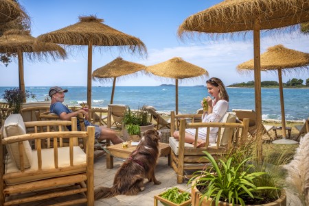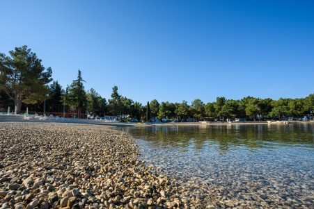 Strand: Der 3 km lange Fels- und Kiesstrand mit sandigen Abschnitten, Liegeflächen, Sportzone mit verschiedenen Sportmöglichkeiten und zwei Strandbars ist je nach Unterbringung ca. 100-800 m entfernt. Liegestühle und Sonnenschirme gegen Gebühr. Der Strand ist mit der „Blauen Flagge" ausgezeichnet, welche für ein sauberes, gepflegtes Küstengebiet mit hervorragender Wasserqualität steht. Ein Hundestrand (in der Nähe der Marina) ist ebenfalls vorhanden.