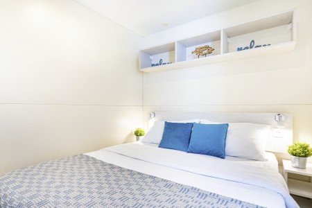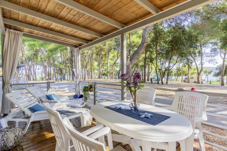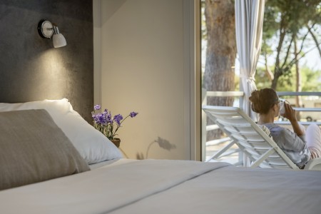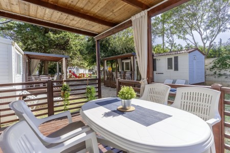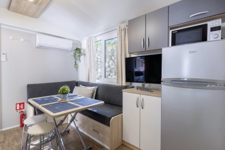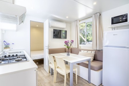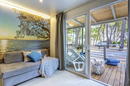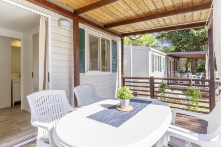 Mobilheim „Superior Relax“ für 4-5 Personen: ca. 32 m², ein Schlafzimmer mit Doppelbett (164x200 cm), ein Schlafzimmer mit zwei Einzelbetten (jeweils 84x200 cm), Wohnraum mit Küchenzeile (E-Herd, Mikrowelle, Kühlschrank), Essecke und Schlafcouch für ein weiteres Kind bis 11,99 Jahre, zwei Badezimmer mit Dusche und WC, überdachte Terrasse (ca. 24 m²) mit Sitzgruppe. Außerdem SAT-TV und Klimaanlage.