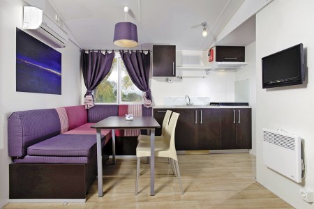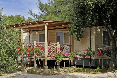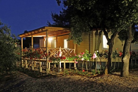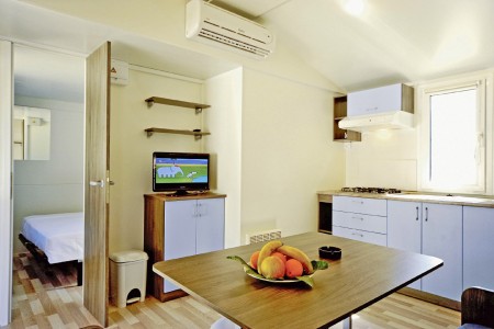 Mobilheim "Luxury" für 4-5 Personen: ca. 40 m², modern ausgestattet, ein Schlafzimmer mit Doppelbett (160 x 200 cm), ein Schlafzimmer mit zwei Einzelbetten (je 80 x 190 cm), Wohnraum mit Küchenzeile (Kühlschrank, Mikrowelle, Herd, Geschirrspüler) und Essecke mit Schlafcouch für ein Kind bis 11 Jahre, Dusche/WC, überdachte Terrasse mit Sitzgarnitur. Außerdem Klimaanlage, SAT-TV und Blick auf die Marina.