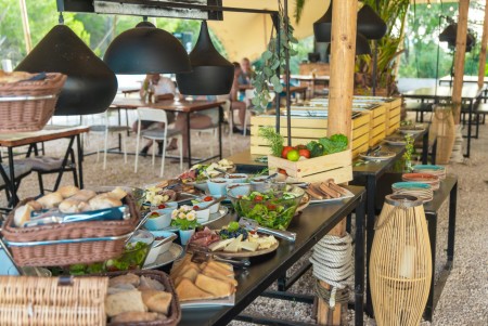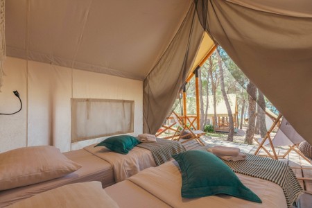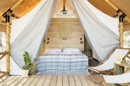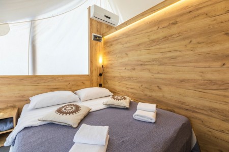 Glamping Zelt "Glamping Lodge M" für 4 Personen: ca. 28 m², zwei Schlafzimmer mit je zwei Einzelbetten, Badezimmer mit Dusche/WC, Föhn, Safe, Klimaanlage, kleiner Wohnbereich, kleiner Kühlschrank mit Tiefkühlfach, überdachte und möblierte Terrasse.