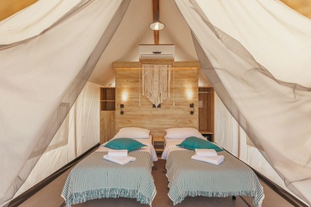 Glamping Zelt "Glamping Lodge S" für 2 Personen: ca. 18 m², Schlafzimmer mit zwei Einzelbetten, Badezimmer mit Dusche/WC, Föhn, Safe, Klimaanlage, kleiner Kühlschrank mit Tiefkühlfach, überdachte und möblierte Terrasse.