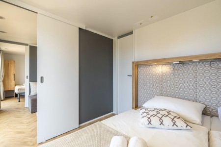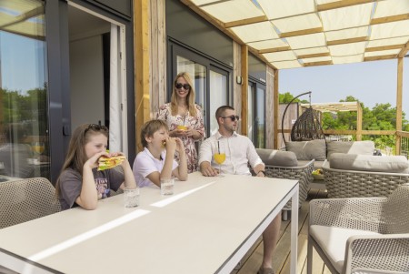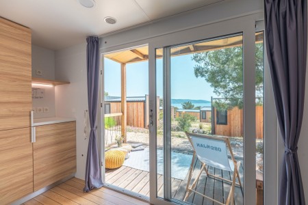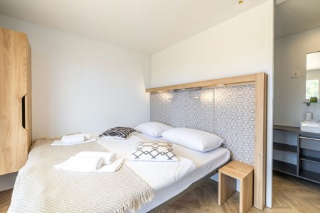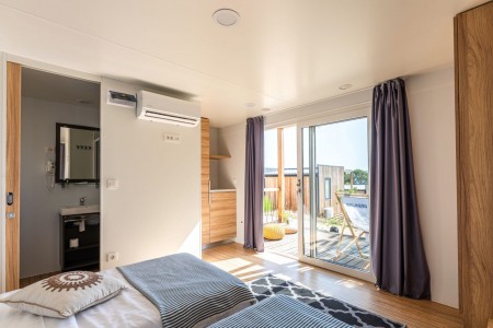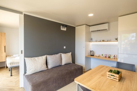 Mobilheim "Island Home M" für 4 Personen: ca. 28 m², zwei Schlafzimmer mit je zwei Einzelbetten, zwei Badezimmer mit Dusche/WC, Föhn, Safe, Klimaanlage, Wohnbereich mit Sofa und Esstisch, kleiner Kühlschrank mit Tiefkühlfach, überdachte und möblierte Terrasse.