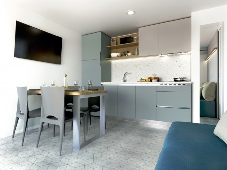 Mobilheim „Family Premium" für 6-7 Personen: ca. 33 m², ein Schlafzimmer mit Doppelbett, zwei Schlafzimmer mit zwei Einzelbetten, zwei Badezimmer mit Dusche/WC, Wohn-Schlafraum mit Essecke und komplett ausgestatteter Küche (Geschirrspüler, Herd, Kühlschrank, Mikrowelle, Wasserkocher, Kaffeemaschine, Nespresso-Maschine) und zusätzlicher Schlafgelegenheit für ein Kind bis 11,99 Jahren, Terrasse mit Tisch und sechs Stühlen, zwei Liegestühlen und Sonnenschirm. Außerdem SAT-TV, Safe und Klimaanlage.