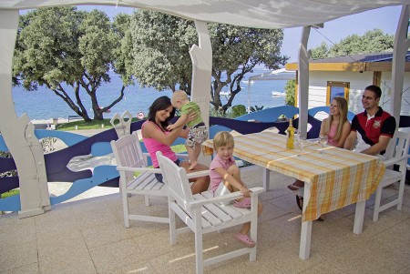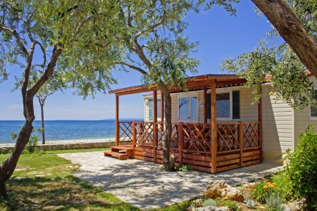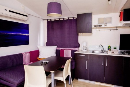 Mobilheim „Adria“ für 4-5 Personen: ca. 34 m², zwei Doppelzimmer, Wohnraum mit Schlafgelegenheit, Essecke und Küchenzeile mit Mikrowelle und Kaffeemaschine, zwei Badezimmer mit Dusche und WC, Terrasse mit Sitzgarnitur und zwei Liegestühlen. Außerdem SAT-TV und Klimaanlage. Buchbar für 4 Erwachsene und 1 Kind bis 11,99 Jahre. Die Mobilheime „Adria“ liegen in der Nähe der Poolanlage, ca. 50-100 m vom Meer entfernt.