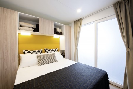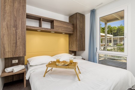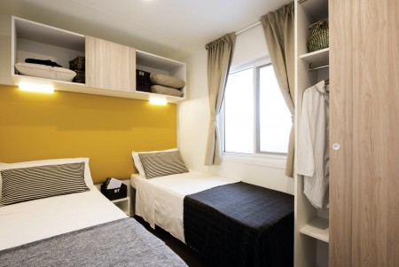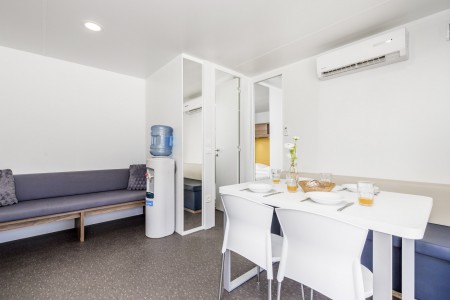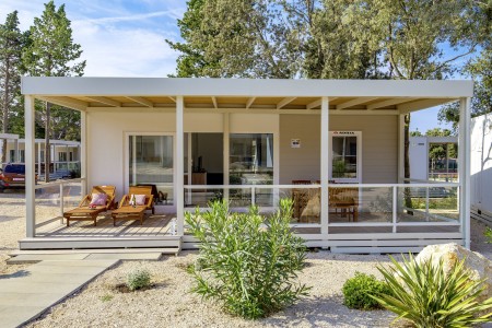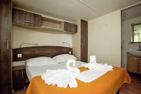 Mobilheim „Premium“ für 4-5 Personen: ca. 34 m², zwei Doppelzimmer, Wohnraum mit Schlafgelegenheit, Essecke und Küchenzeile mit Mikrowelle und Kaffeemaschine, zwei Badezimmer mit Dusche und WC, Terrasse mit Sitzgarnitur und zwei Liegestühlen. Außerdem SAT-TV und Klimaanlage. Buchbar für 4 Erwachsene und 1 Kind bis 11,99 Jahre. Die Mobilheime „Premium“ liegen in Spielplatz- und Strandnähe.