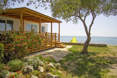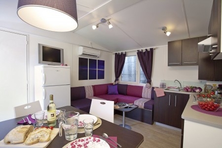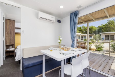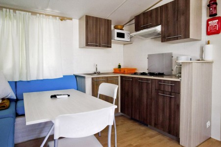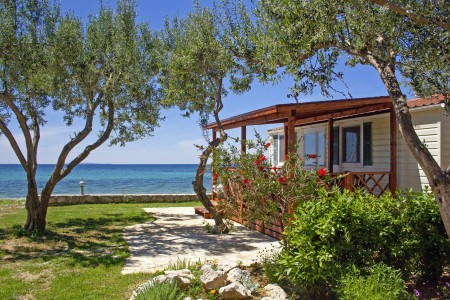 Mobilheim „Olive“ für 4-5 Personen: ca. 34 m², zwei Doppelzimmer, Wohnraum mit Schlafgelegenheit, Essecke und Küchenzeile mit Mikrowelle und Kaffeemaschine, zwei Badezimmer mit Dusche und WC, Terrasse mit Sitzgarnitur und zwei Liegestühlen. Außerdem SAT-TV und Klimaanlage. Buchbar für 4 Erwachsene und 1 Kind bis 11,99 Jahre. Die Mobilheime „Olive“ liegen neben der Poolanlage, ca. 50-100 m vom Meer entfernt.