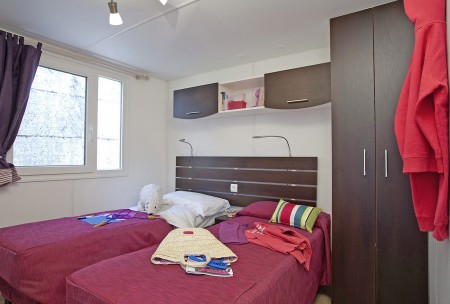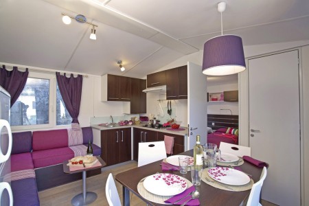 Mobilheim „Mediteran“ für 4-6 Personen: ca. 34 m², zwei Doppelzimmer, Wohnraum mit Schlafgelegenheit, Essecke und Küchenzeile mit Mikrowelle und Kaffeemaschine, zwei Badezimmer mit Dusche und WC, Terrasse mit Sitzgarnitur und zwei Liegestühlen. Außerdem SAT-TV und Klimaanlage. Buchbar für 4 Erwachsene und 2 Kinder bis 11,99 Jahre. Die Entfernung zum Meer beträgt ca. 150 m.