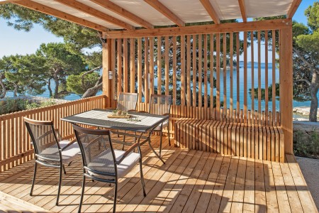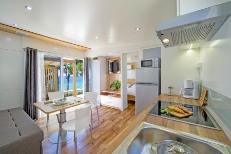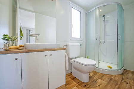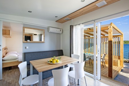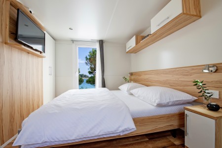Mobilheim „Superior“ für 4-5 Personen: ca. 36 m², stilvoll und modern eingerichtet, im autofreien Bereich „Adria Village“ gelegen. Ein Doppelzimmer mit Doppelbett, ein Doppelzimmer mit zwei Einzelbetten, zwei Badezimmer mit Dusche/WC, Wohn-Schlafraum mit Sitzecke (Schlafgelegenheit für 1 Kind bis 12 Jahre), Esstisch und Küchenzeile mit Herd, Kühlschrank, Mikrowelle und Kaffeemaschine. Eigene Gartenparzelle und große überdachte Terrasse mit Sitzgruppe, Sonnenschutz und zwei bequemen Liegestühlen, Außendusche und Grill. Außerdem WiFi-Internet (kostenlos), SAT-TV und Klimaanlage. Zugang zum privaten Swimmingpool, der nur den Gästen der Superior-Mobilheime zur Verfügung steht. Parkplatz außerhalb des autofreien Bereiches (1 Parkplatz pro Mobilheim kostenlos).