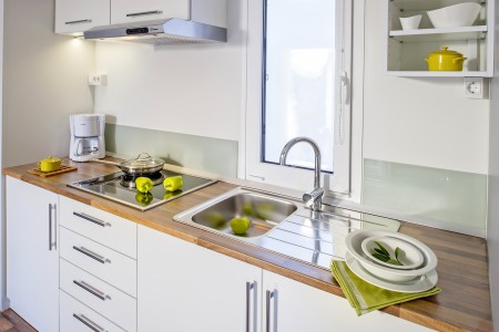 Mobilheim „Lux“ für 4-5 Personen: ca. 32 m², ein Doppelzimmer mit Doppelbett, ein Doppelzimmer mit zwei Einzelbetten, zwei Badezimmer mit Dusche/WC, Wohn-Schlafraum mit Sitzecke (Schlafgelegenheit für 1 Kind bis 12 Jahre), Esstisch und Küchenzeile mit Herd und Kühlschrank. Überdachte Terrasse mit Sitzgruppe. Außerdem SAT-TV und Klimaanlage. Kostenloser Parkplatz für 1 PKW am Mobilheim. WiFi-Internet verfügbar (gegen Gebühr).