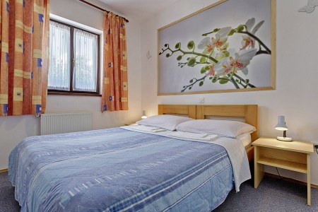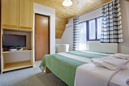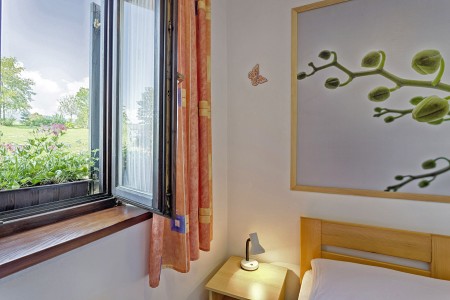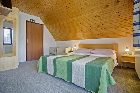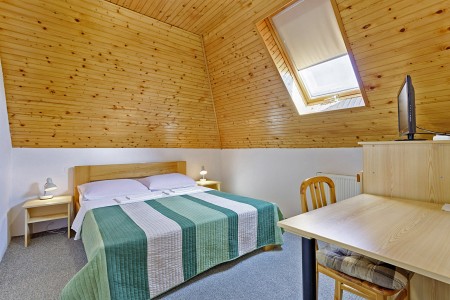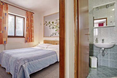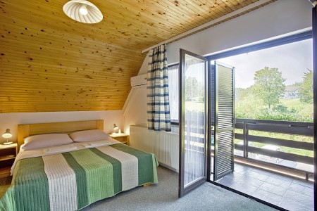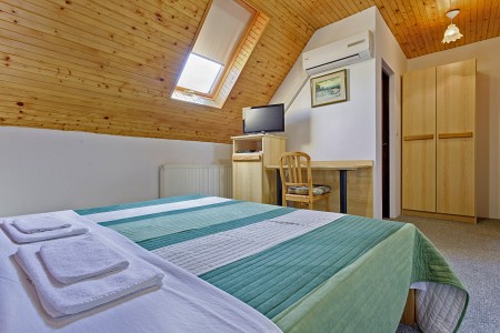 Doppelzimmer: ca. 19 m² in der zweiten Etage (Dachgeschoss), ein Doppelbett, Klimaanlage, SAT-TV, Zentralheizung, Badezimmer mit Dusche und WC, Balkon mit Blick auf den Garten.