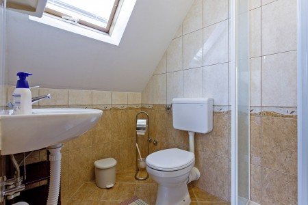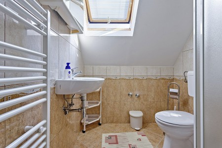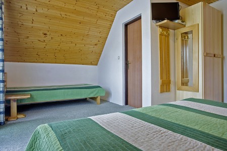 Dreibettzimmer: ca. 21 m² in der zweiten Etage (Dachgeschoss), ein Doppelbett, ein Einzelbett, Klimaanlage, SAT-TV, Zentralheizung, Badezimmer mit Dusche und WC, Balkon mit Blick auf den Garten.