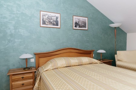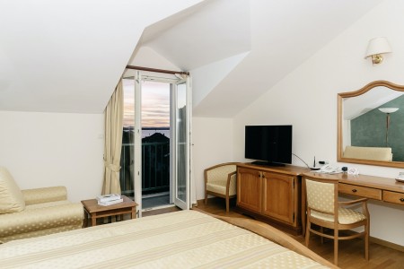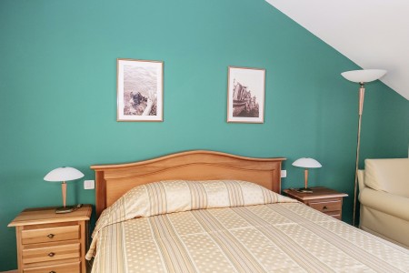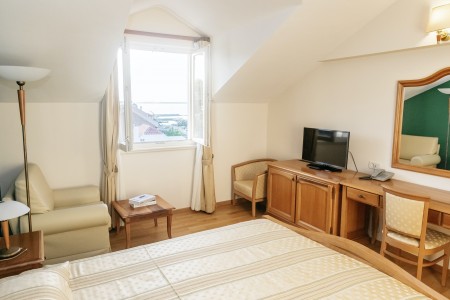 Dreibettzimmer: ca. 27 m², großes Doppelbett (180 x 200 cm), zusätzliches Bett (120 x 200 cm), auch mit Balkon mit Inselblick buchbar.