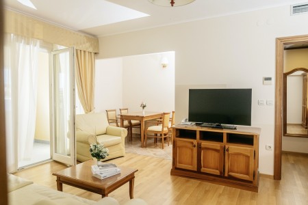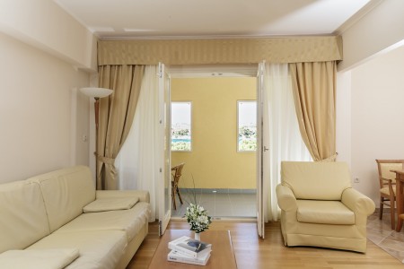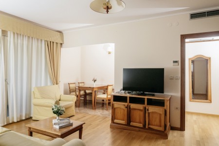 Suite: ca. 59 m², Doppelbett (180 x 200 cm), separates Wohnzimmer mit Essbereich und Ausziehsofa mit Schlafgelegenheit für 2 weitere Personen (160 x 200 cm), Balkon oder Terrasse mit Meerblick